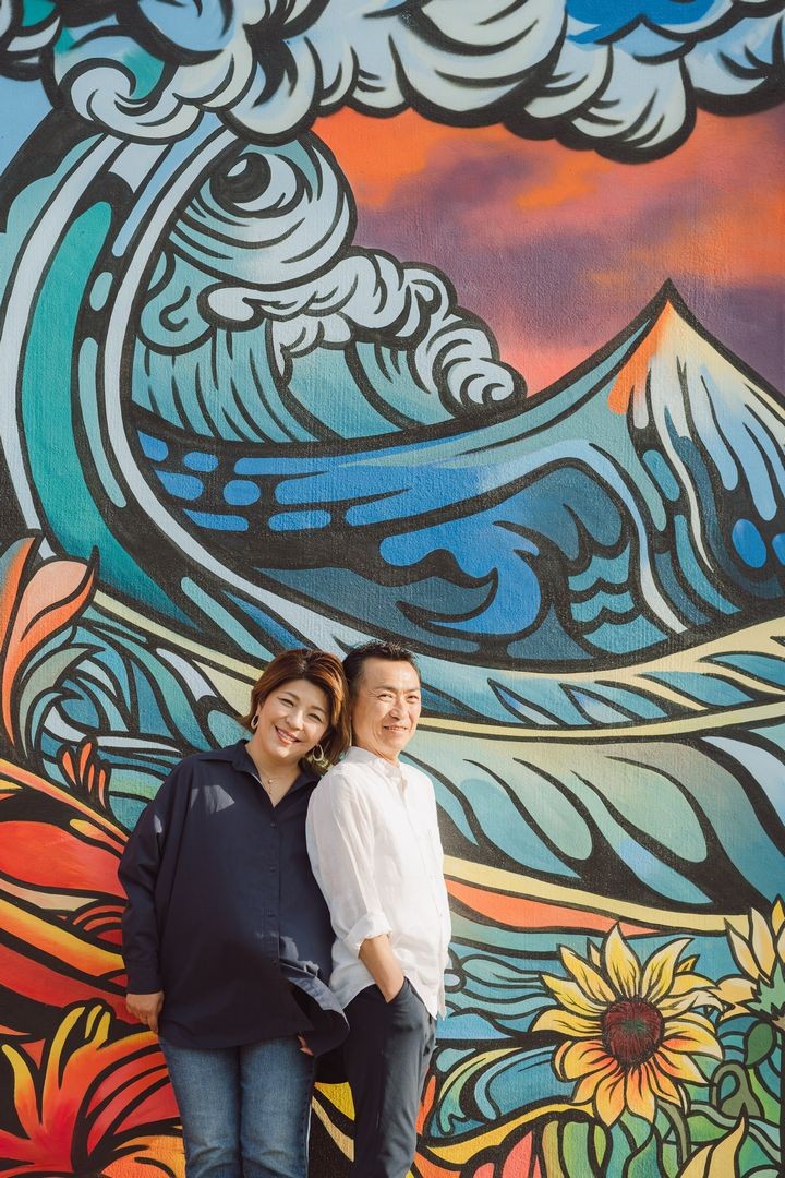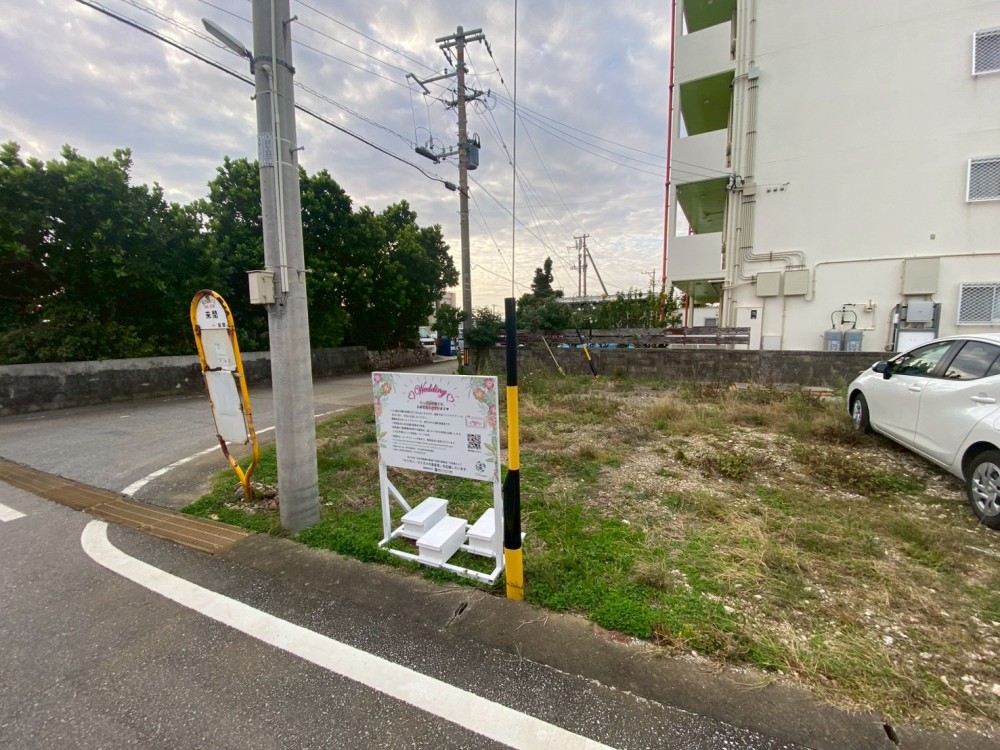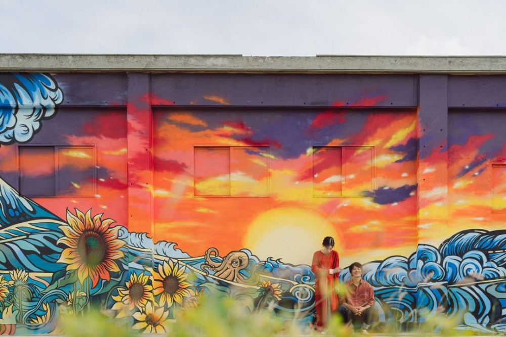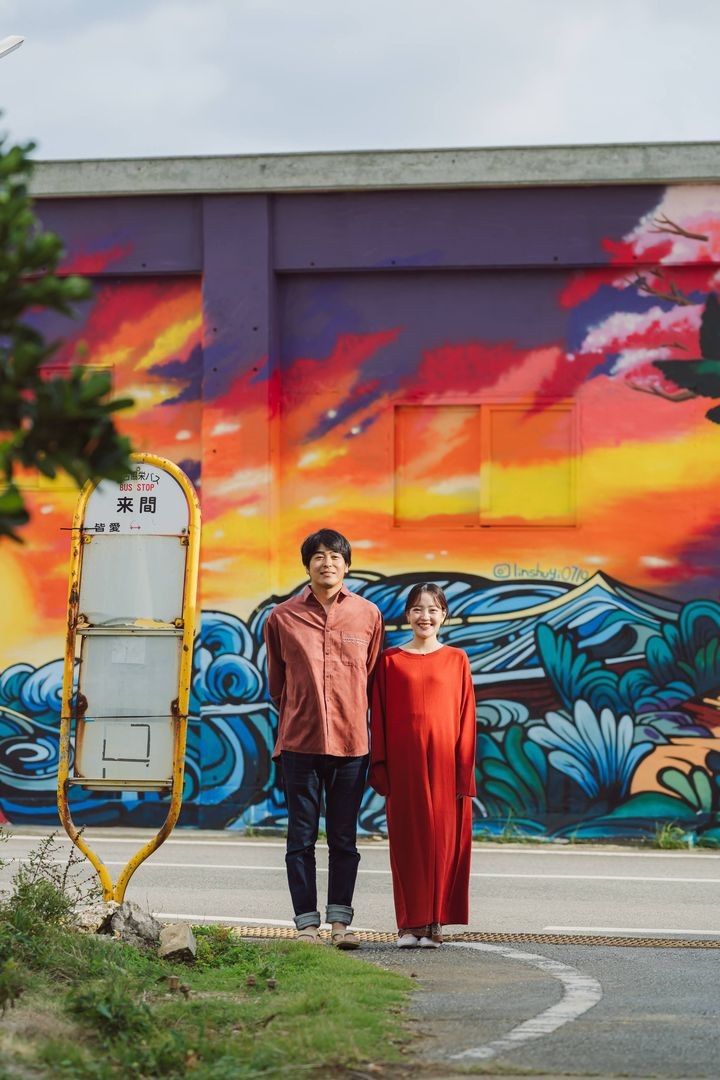 来間島「光が差しこむフォトスポット」 夕陽の海や向日葵、島の風景が描かれた壁画。 波と家の間に立つと、ふたりの未来に光が差しこむような写真が撮れる特別な場所です。 駐車場あり、建物の向かいのバス亭隣スペースにご駐車ください。トイレ無し。